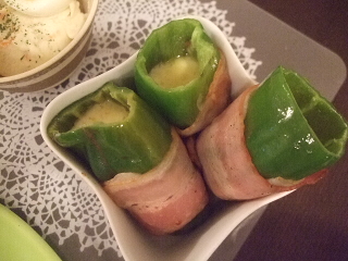 ピーマンをくりぬ抜き、ベーコンを巻いてコロコロと焼いてから