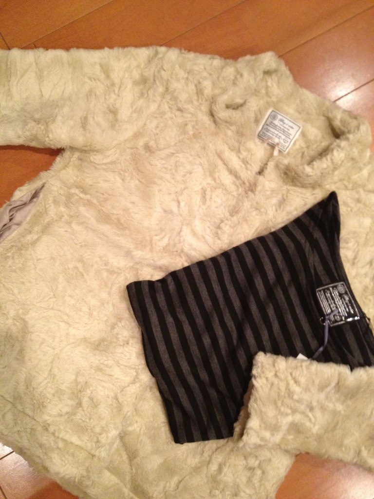 白いファージャケットと、ボーダーワンピを購入