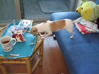 私のおやつの残骸を狙うミュークさん・・・